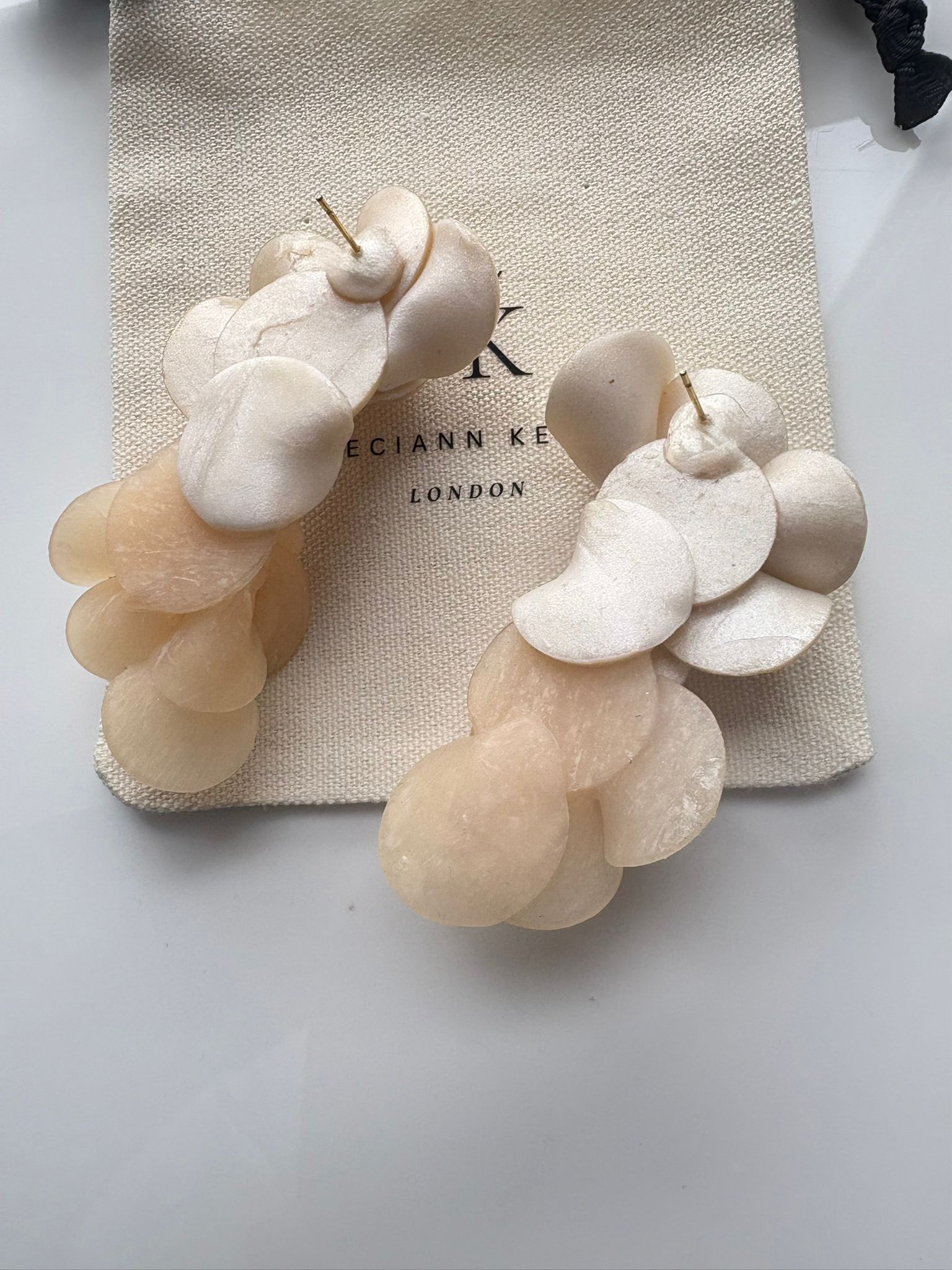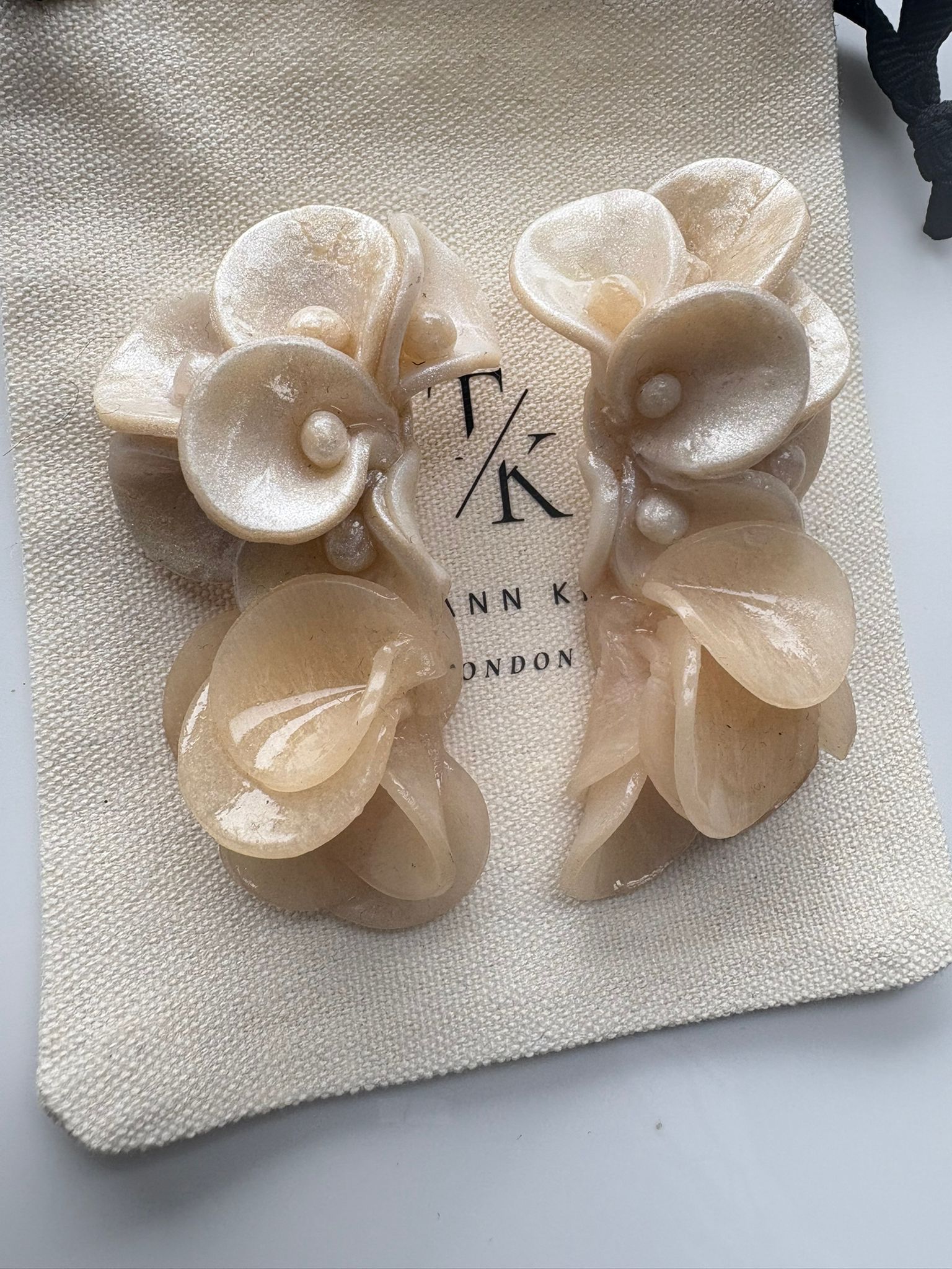 Indulge in the artistry of nature-inspired design with these breathtaking statement studs. Each piece features a cluster of hand-sculpted petals in a warm honey-cream hue, with a subtle glossy finish that catches light to create a luminous, dimensional effect. The organic arrangement of petals – mixing open blooms and curved discs – gives each earring a unique, handcrafted character that celebrates artisanal skill.