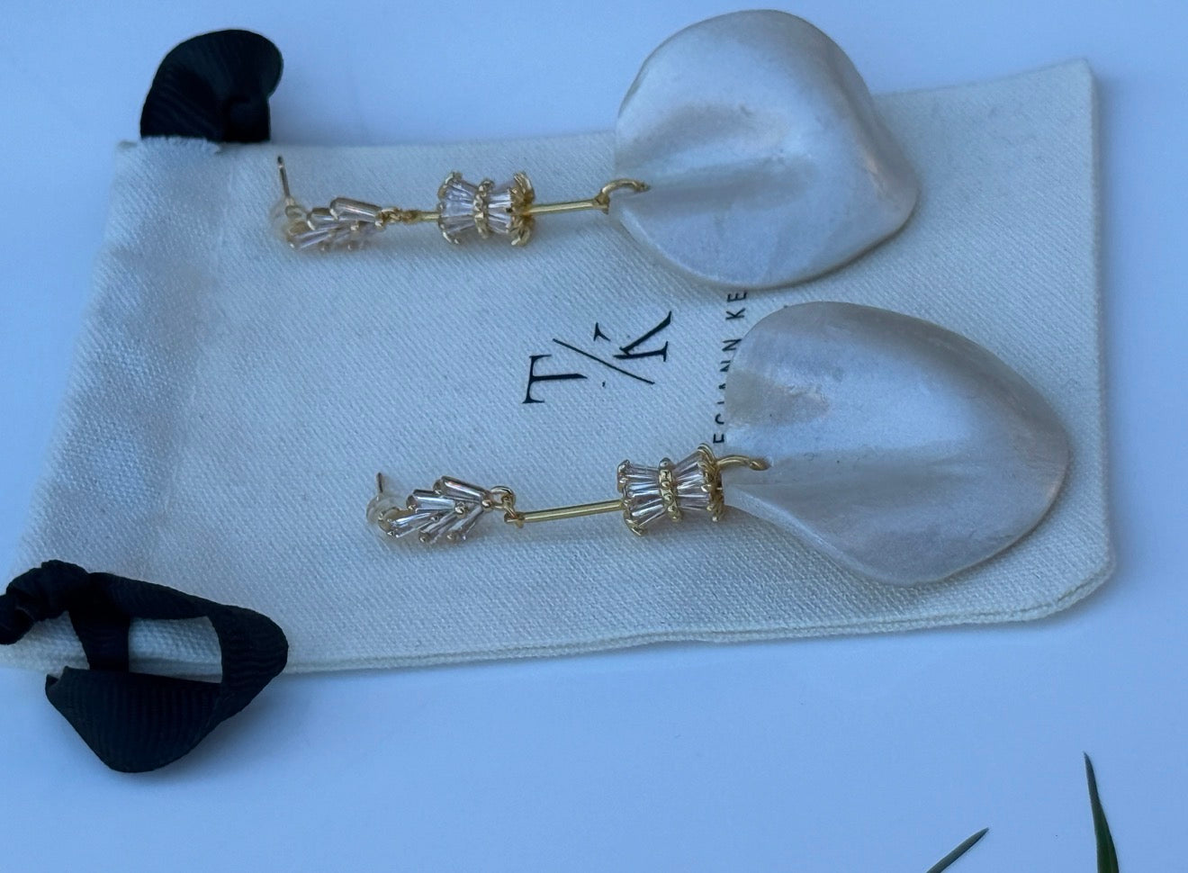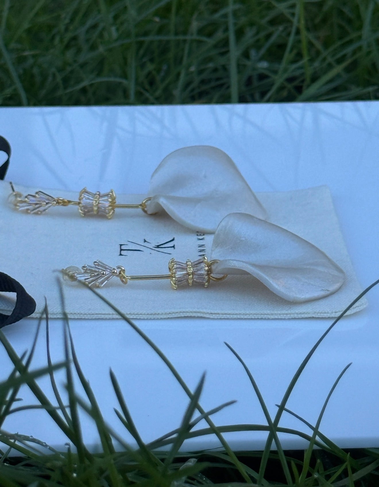 Elevate your jewellery collection with these exquisite drop earrings, where delicate design meets artisanal craftsmanship. Each piece features a single, silky-smooth ivory petal – shaped to mimic the soft drape of a natural flower, paired with a polished gold-tone bar adorned with faceted clear crystals. The crystals catch and reflect light with every movement, while the petal’s glossy