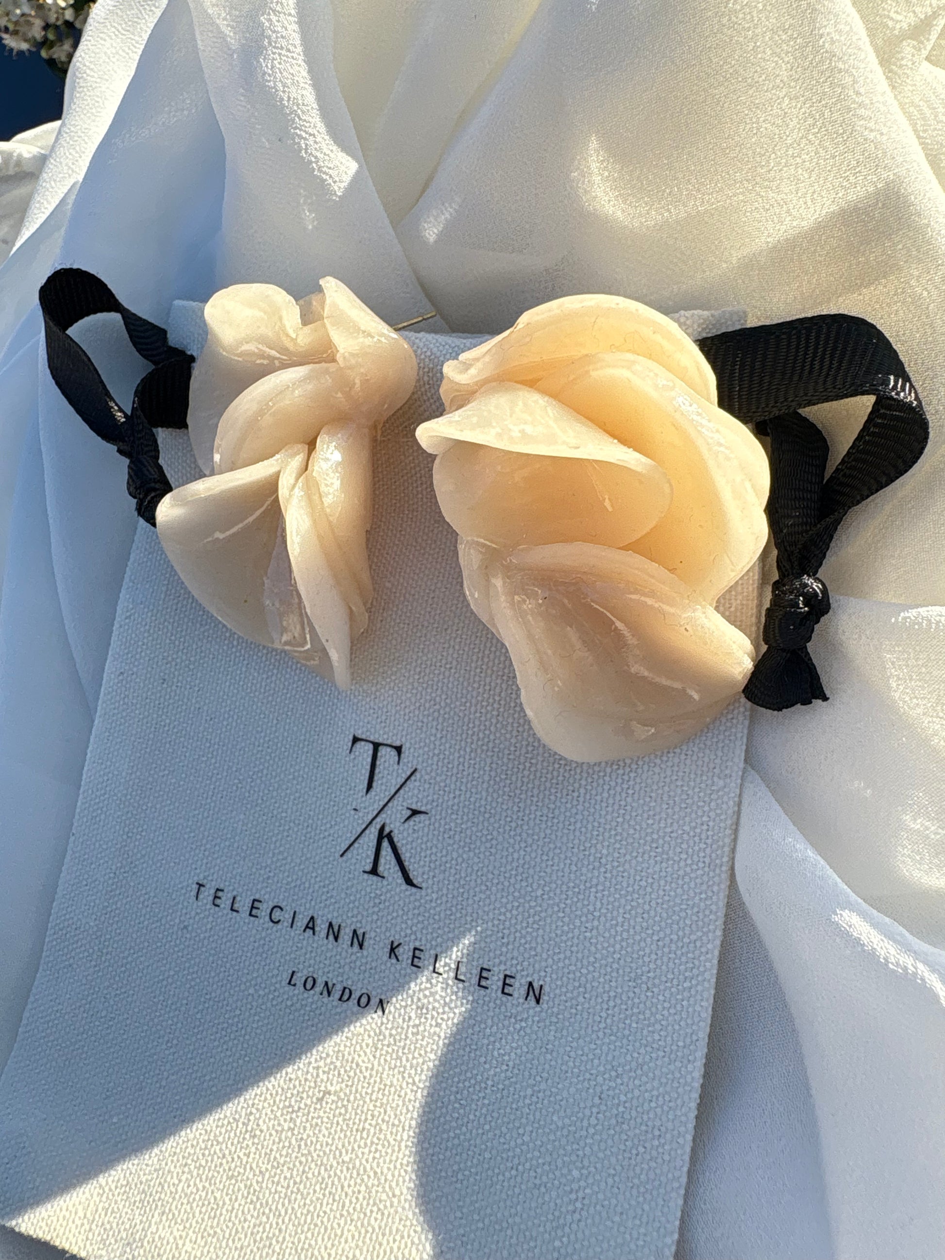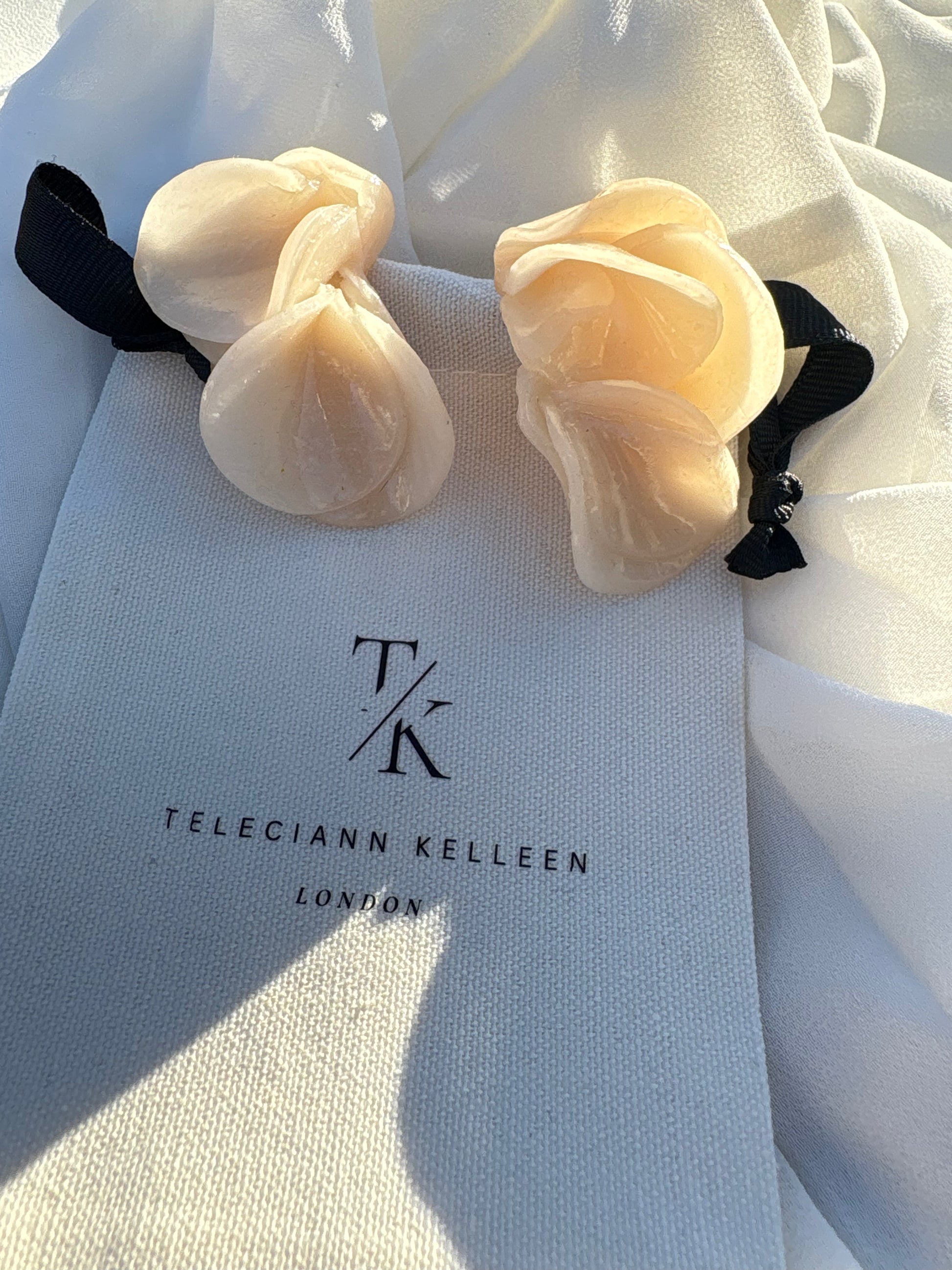 These elegant statement earrings are a work of art, each time they are made, they are slightly different. They showcase hand-sculpted petals in a delicate ivory hue with shine, with subtle translucency that catches light beautifully. Crafted to mimic natural blooms, each piece has a unique, organic shape that adds soft sophistication to any look. The petals are paired with lightweight and designed for comfortable wear, whether dressing up for an evening event or elevating everyday style. A signature piece from London-based brand Teleciann Kelleen, blending artisanal craftsmanship with timeless design.
