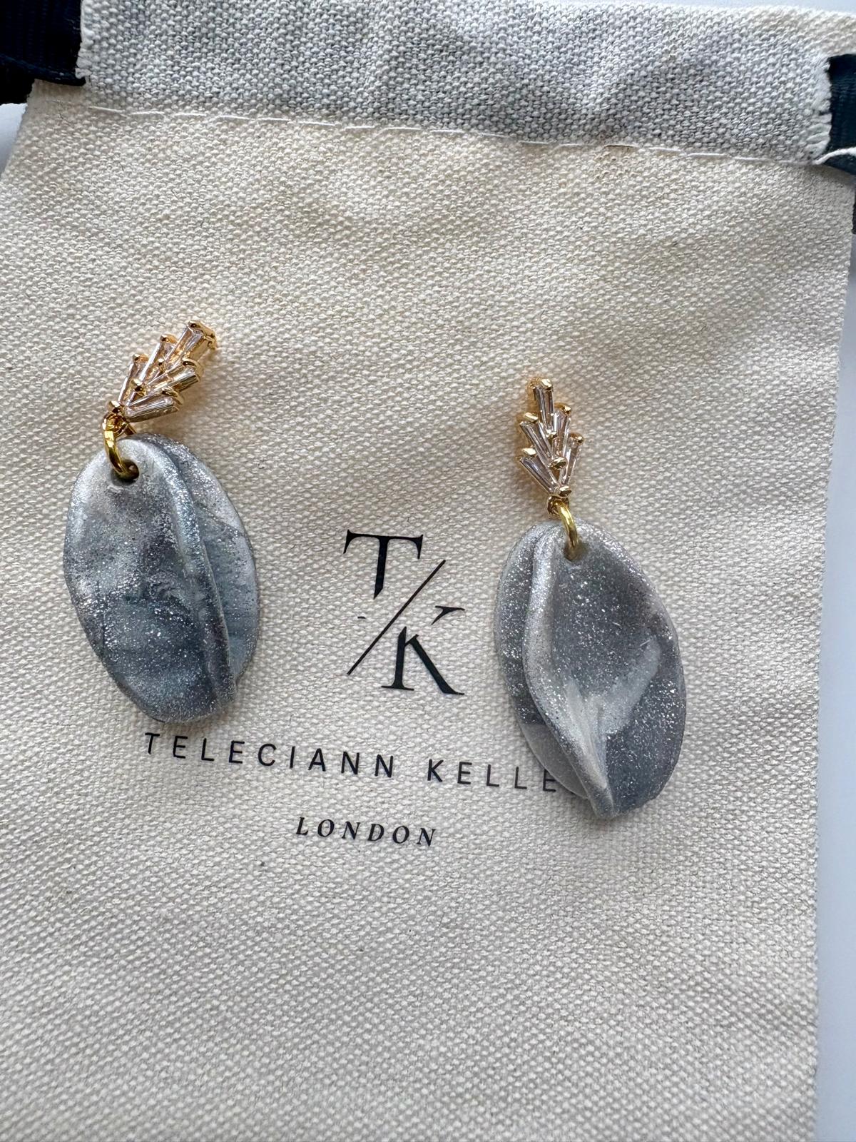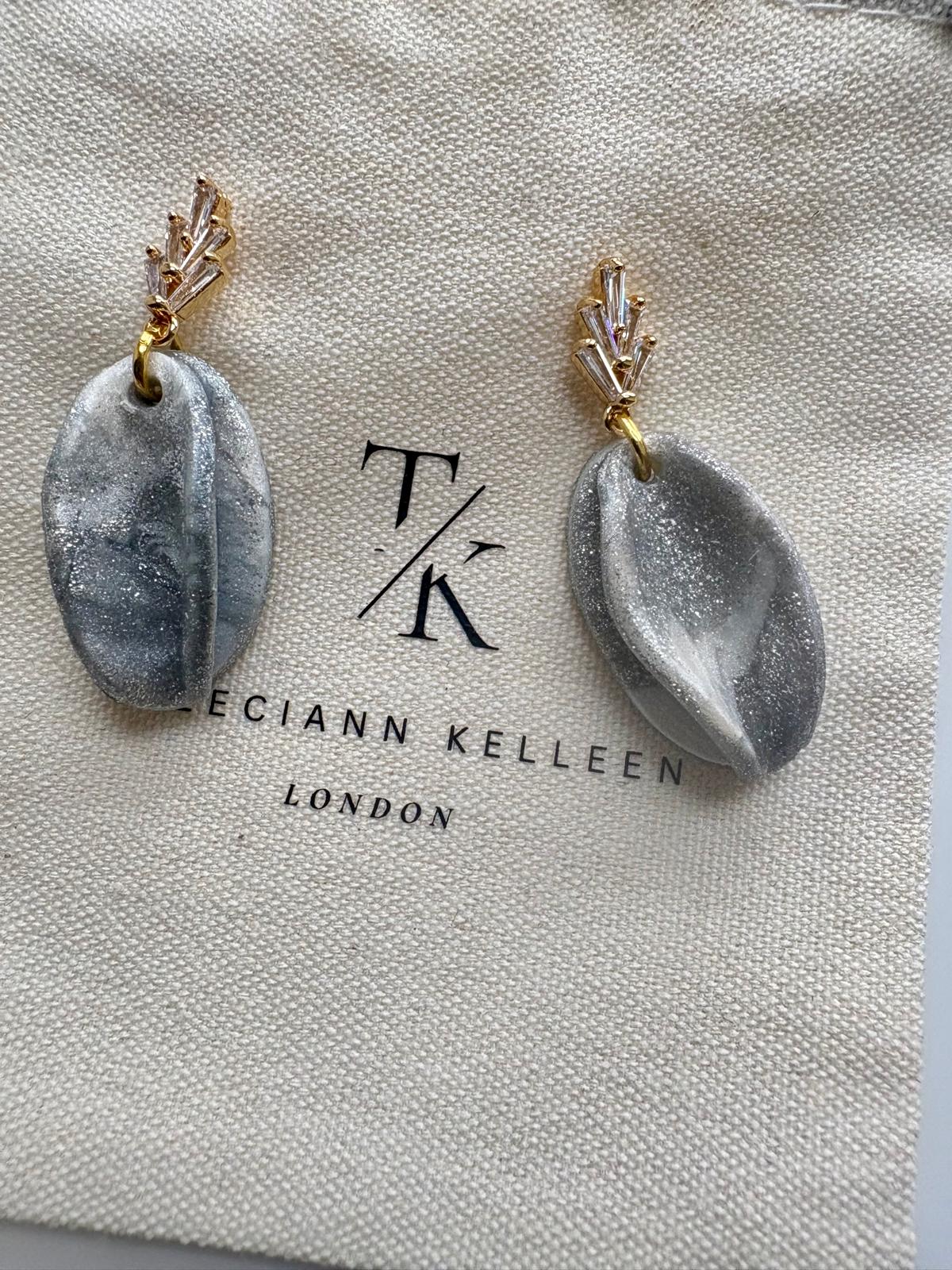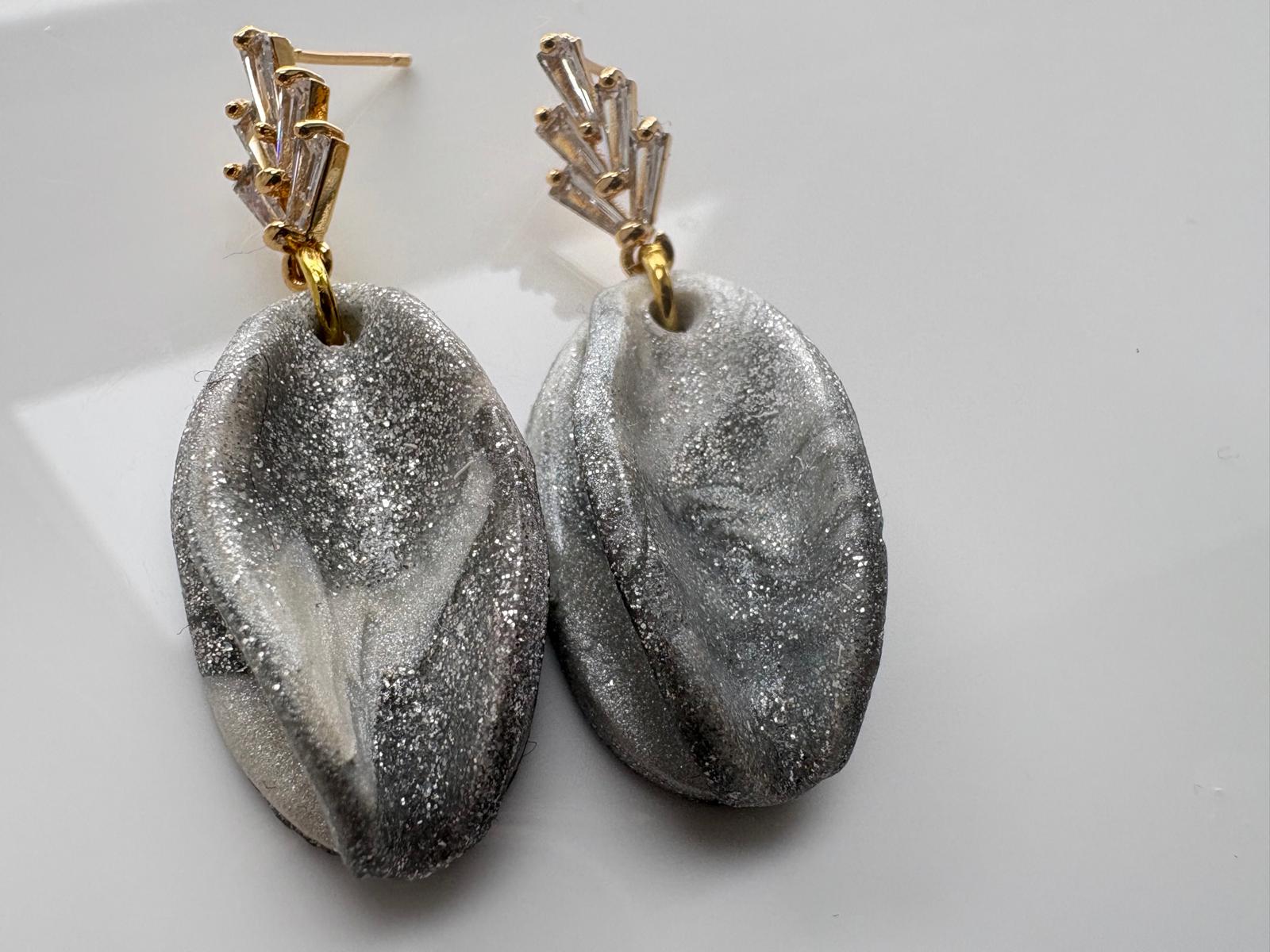Softly sculpted with a shimmering silver marbled with pearl and a sheen on top, these statement drop earrings balance modern elegance with subtle glamour. The organic oval form catches the light beautifully, creating a gentle glow that enhances the natural movement of the piece.