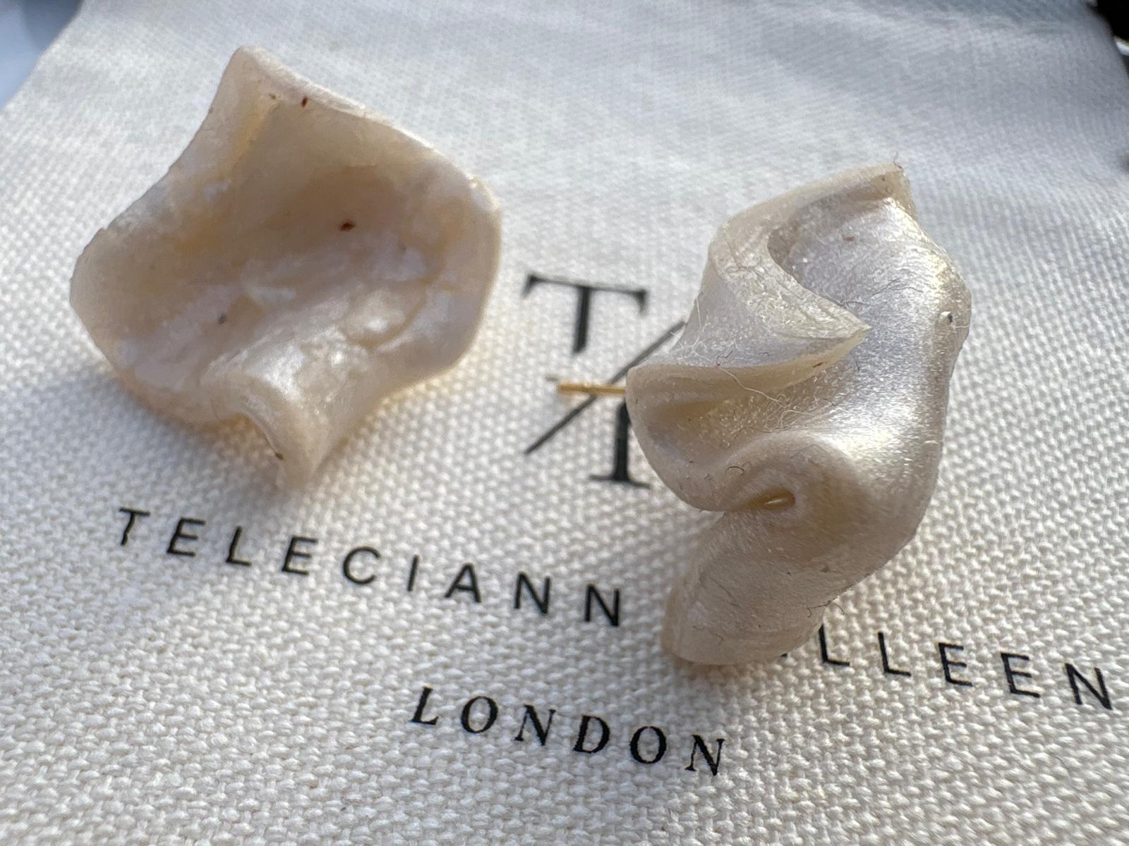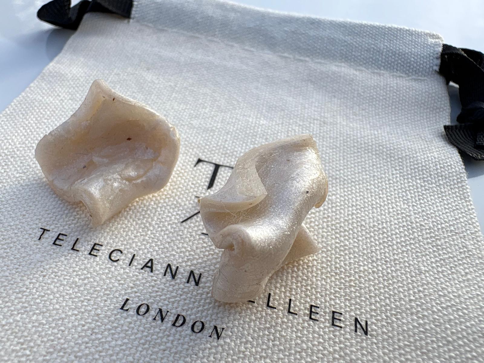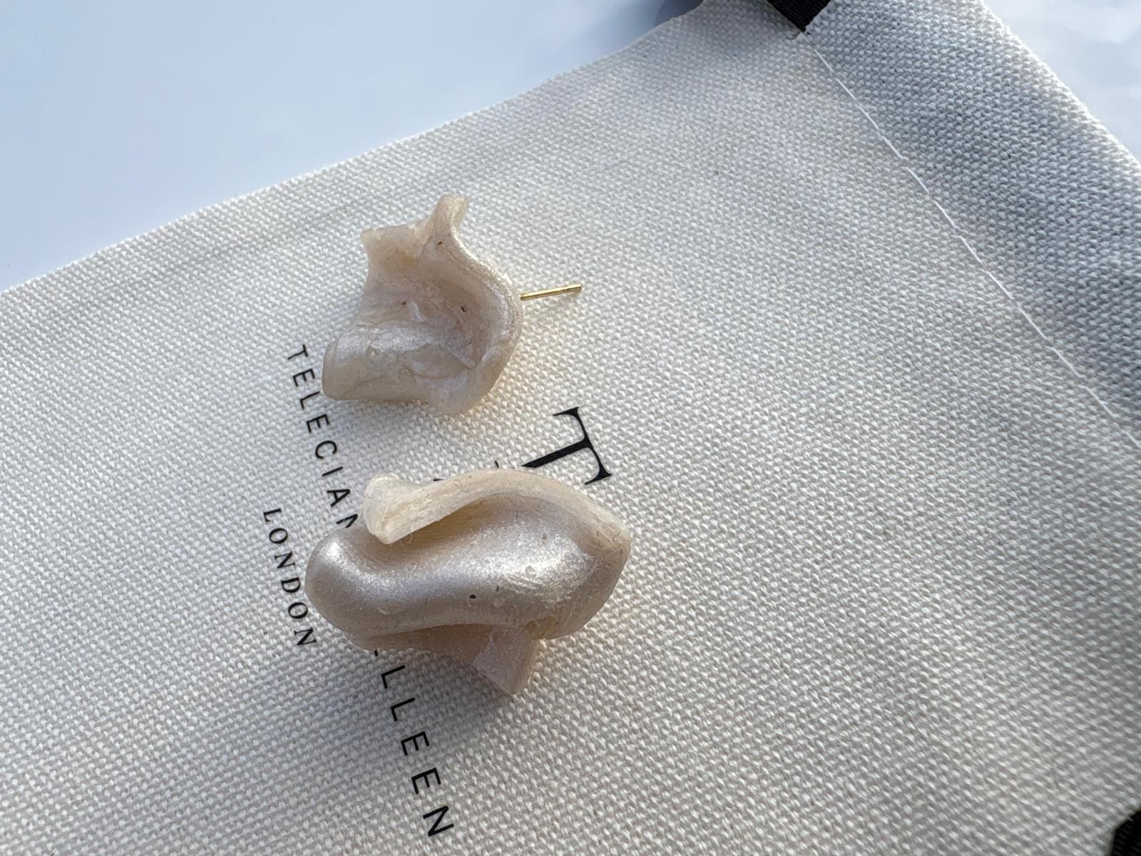 Embrace understated luxury with these sculpted stud earrings, where fluid form meets delicate texture. Each piece is hand-shaped to mimic the soft drape of folded silk or a gently curled, squared finished in a warm creamy-ivory hue with a subtle pearlescent sheen that catches light beautifully. The organic, asymmetric design ensures every pair is unique, celebrating the artisanal craftsmanship at the heart of the brand.