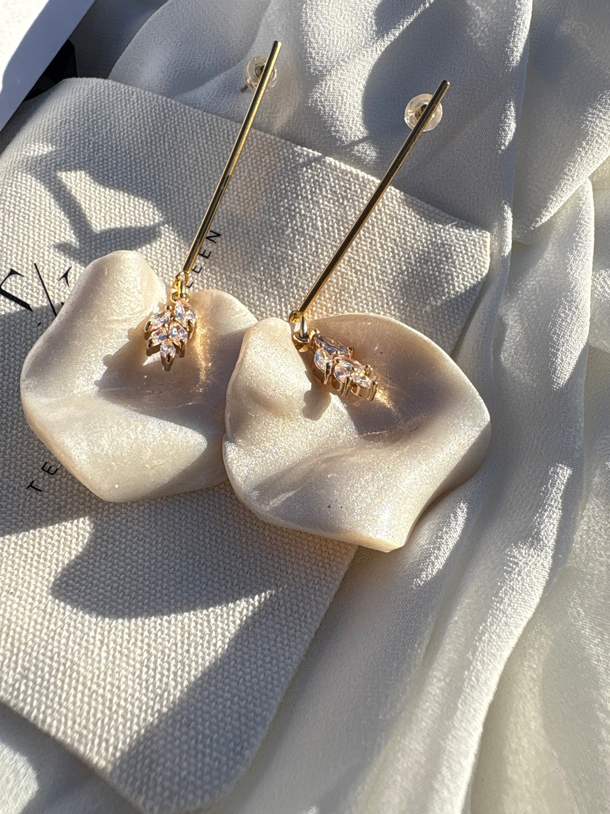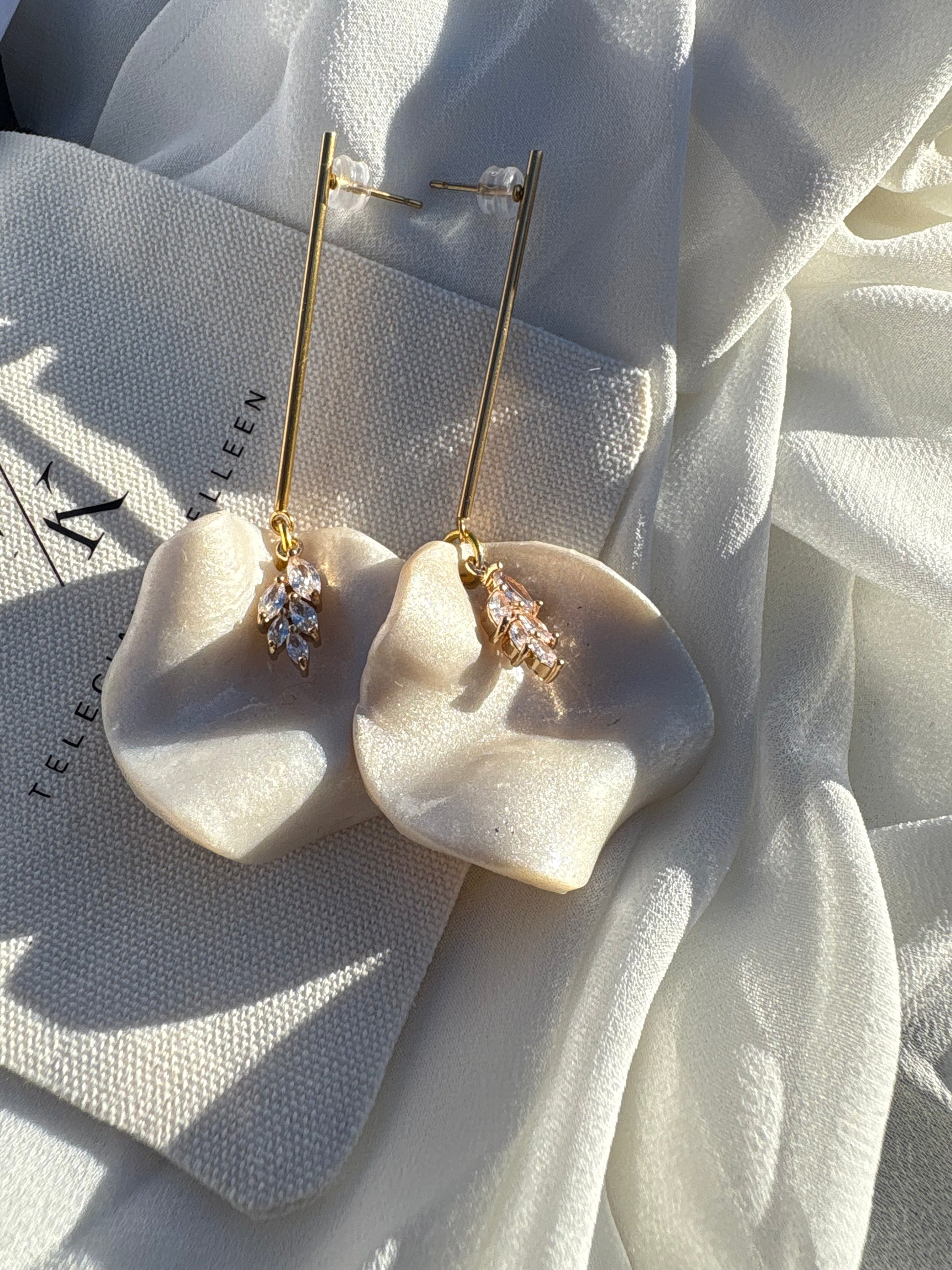 Lumière Fleur is a delicate drop earring that feels soft, luminous, and quietly luxurious. A sculpted, petal-like form in a pearlescent ivory finish unfolds with fluid curves, catching the light like silk in the sun. From its heart hangs a small cluster of clear, faceted stones—subtle but radiant—adding a gentle sparkle with every movement.