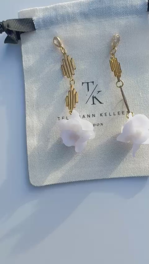 A sophisticated blend of architectural design and soft femininity, these asymmetric drop earrings showcase the brand’s signature London style. The earrings feature polished gold-plated components – one with stacked geometric bars, the other with sleek linear links – each topped with a subtly detailed loop. Below, delicate blush-hued flower petals cascade gracefully, creating a striking contrast between structured modernity and organic charm. Lightweight and meticulously crafted, they are perfect for elevating both casual and formal ensembles, adding a unique touch of elegance to any look.